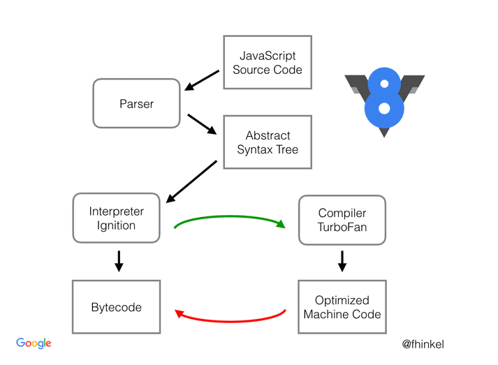 최적화 기법으로는 히든 클래스(Hidden Class)나 인라인 캐싱(Inline Caching) 등 여러가지 기법을 사용하지만 이 내용은 추후 다른 포스팅에서 더 자세히 다루도록 하겠다. 간단히만 설명하자면 히든 클래스는 비슷한 놈들끼리 분류해놓고 가져다 쓰는 것, 인라인 캐싱은 자주 사용되는 코드가 만약 hello()와 같은 함수의 호출부라면 이걸 function hello () { ... }와 같이 함수의 내용으로 바꿔버리는 것이다. 말 그대로 캐싱(Caching)이다.