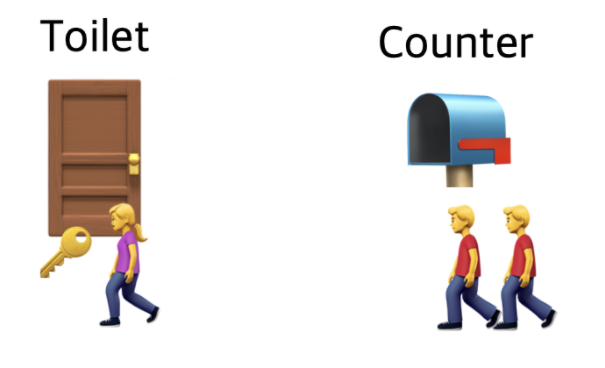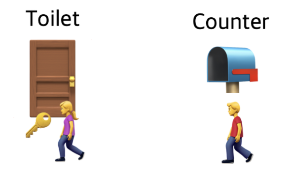 - 당신이 화장실에서 나온 뒤 카운터에 키를 돌려 놓게되면 기다리던 사람 중 맨앞에 있던 사람이 키를 받아 화장실을 사용할 수 있다.